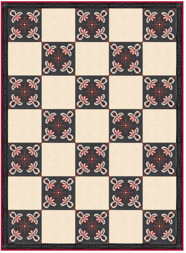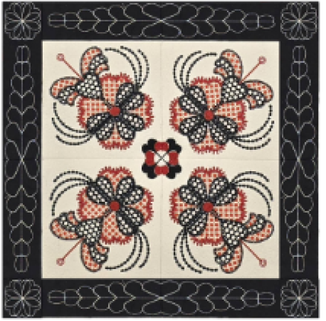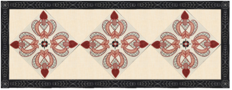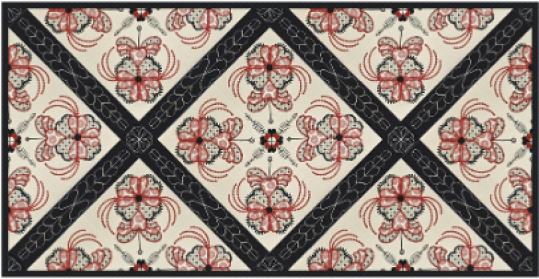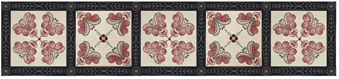 The Hidden Hearts wall hanging is an original design by Carol Mancuso. This set of embroidery files is designed to be versatile for creating not only this 44 x 44 wall hanging, but table runners, or pillows, or even tote bags. The blocks, sashing, and corner stones are all quilted as you go. After the wall hanging is assembled, add backing fabric and stitch in the ditch to finish.